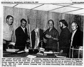 The first uniform worn by Col Vincent J-R Kehoe on April 19, 1970 as a Light Infantry officer is shown on the right. Over the next few years every element of this uniform and its accoutrements have been changed or refined reflecting new information that became available from research conducted by Col Kehoe. By 19 April 1972, The American Contingent had grown to two companies, Light Infantry and Grenadiers as well as a Company of Music. By 1975, the Regiment added a Battalion (aka. Hat) company to its ranks, which had swelled to over 100.